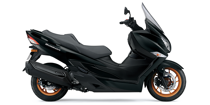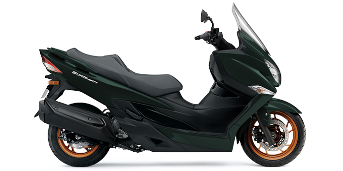 Een vormgeving die wordt gekenmerkt door de nieuwe LED-koplampen en de eveneens met LED-techniek uitgeruste achterlichtunit. Deze maxiscooter, die ook bekendstaat als Suzuki AN400A, is daardoor overal inzetbaar, of je nu naar je werk rijdt of in het weekend een flinke toertocht maakt, al dan niet met duopassagier.